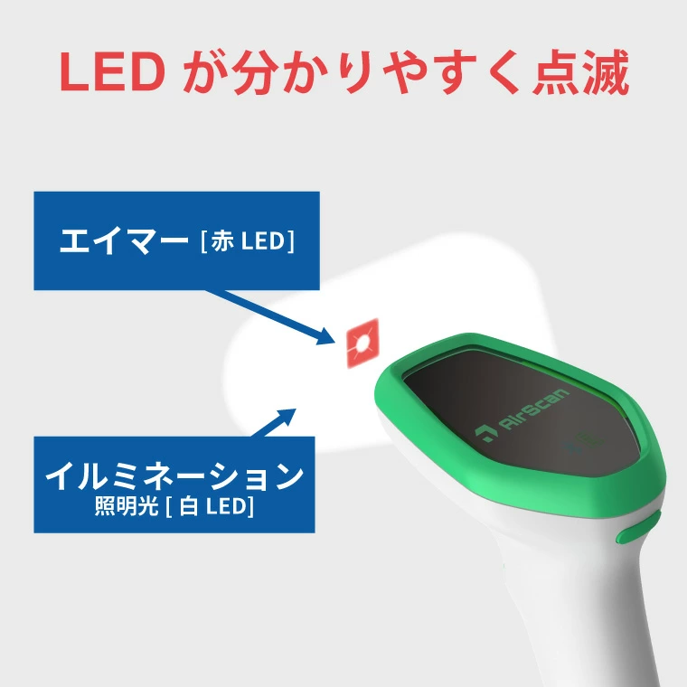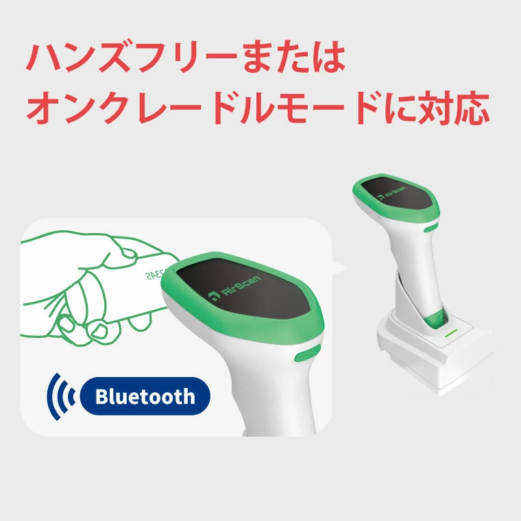 AirScan Handheldは、ハンドヘルドおよびクレードル設置によるハンズフリーモードに対応したBluetoothコードリーダーです。Bluetooth 5.0 DUAL MODE搭載で、最大約50m範囲でのリアルタイム通信が可能です。LEDインジケーターやステータスアイコンにより、スキャン状況やバッテリー状態がひと目で確認できます。