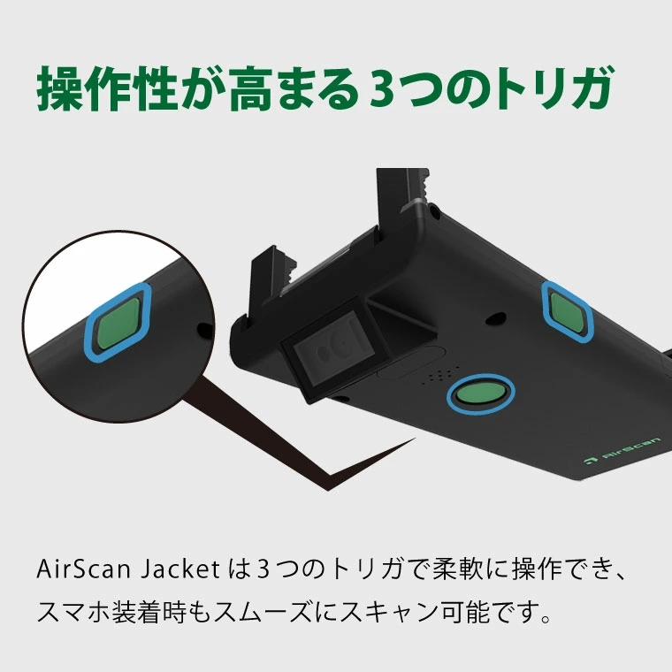 AirScan Jacketは、アームでスマートフォンを固定し、一体型端末として利用できる2Dコードリーダーです。内蔵スキャンエンジンにより単体でも読み取りが可能で、Bluetooth接続を介してiOS・Android・Windowsに対応します。多様な端末サイズに対応し、作業性向上につながる操作構造を備えています。
