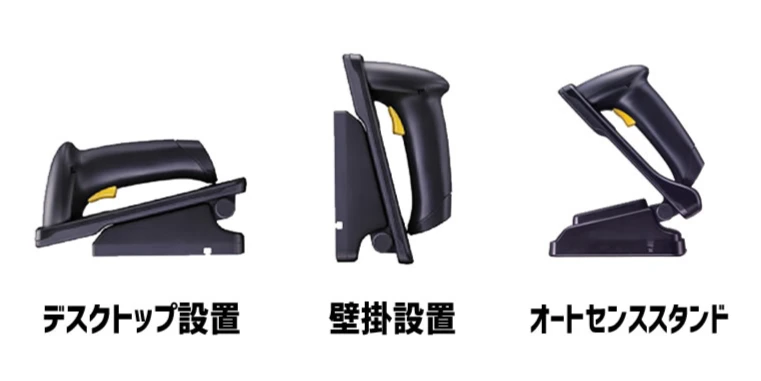 デスク設置・壁掛け・オートセンススタンドとして利用できる3-in-1スタンドを付属。 オートセンスモードではトリガー操作不要で、コードをかざすだけで読み取れます。