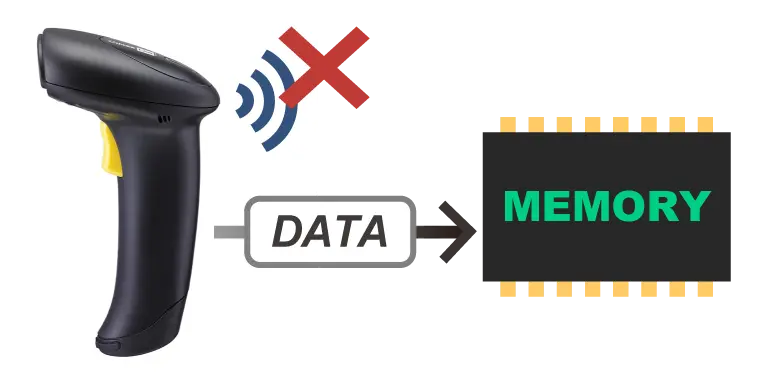 無線エリア外でも利用できるバッチモードを備え、読み取ったデータを内蔵メモリ(4MB)に一時保存できます。作業後にまとめてPCなどへ転送することが可能です。